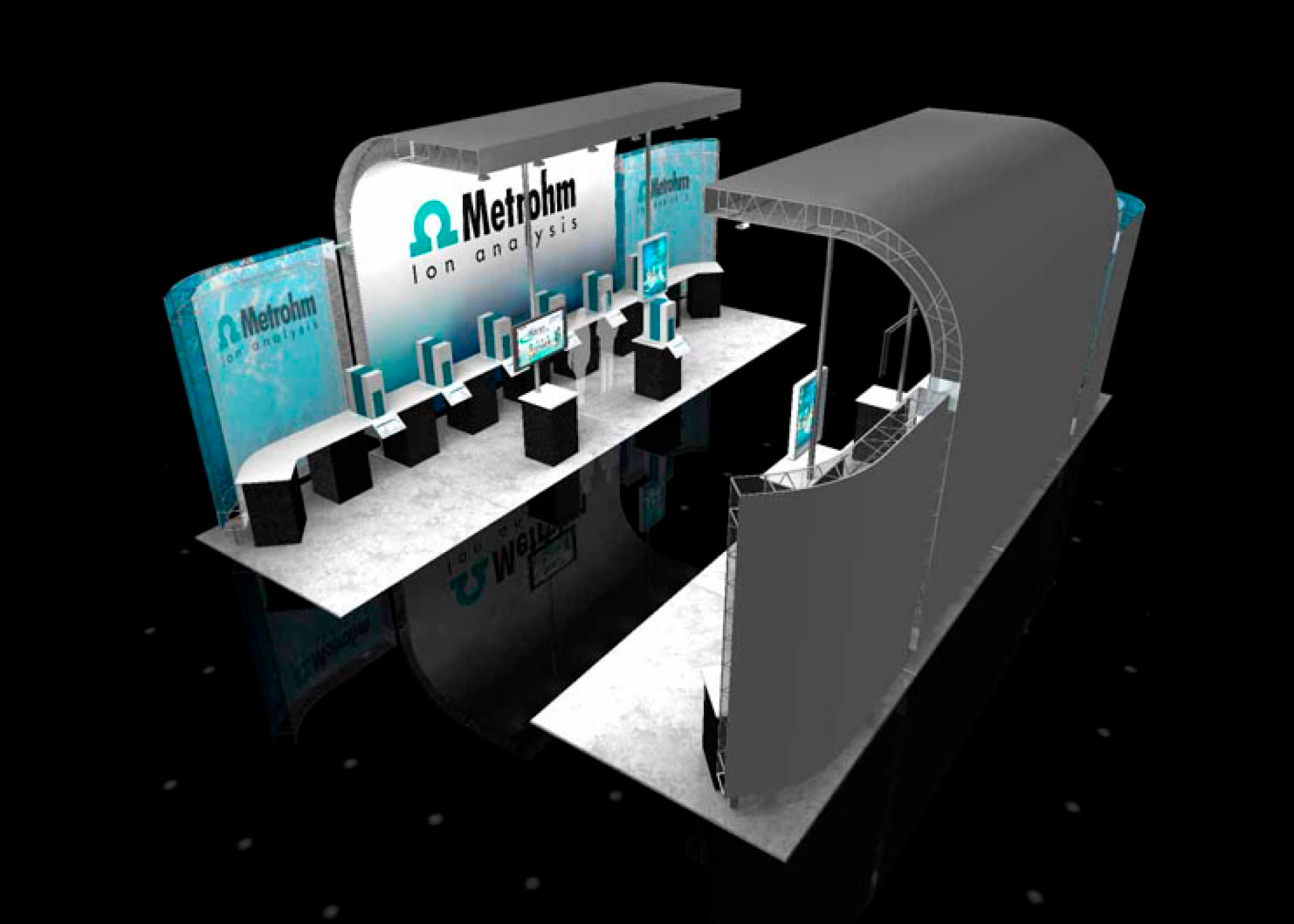 Metrohm had arranged for two adjacent 10′ X 40′ spaces across from each other. I elected to block off the facilities lighting and utilize more near-field and controllable lights. This was not a sacrifice in the end but a benefit with the more important over-head structural feature providing a better defined space that also blocked out some of the noise.